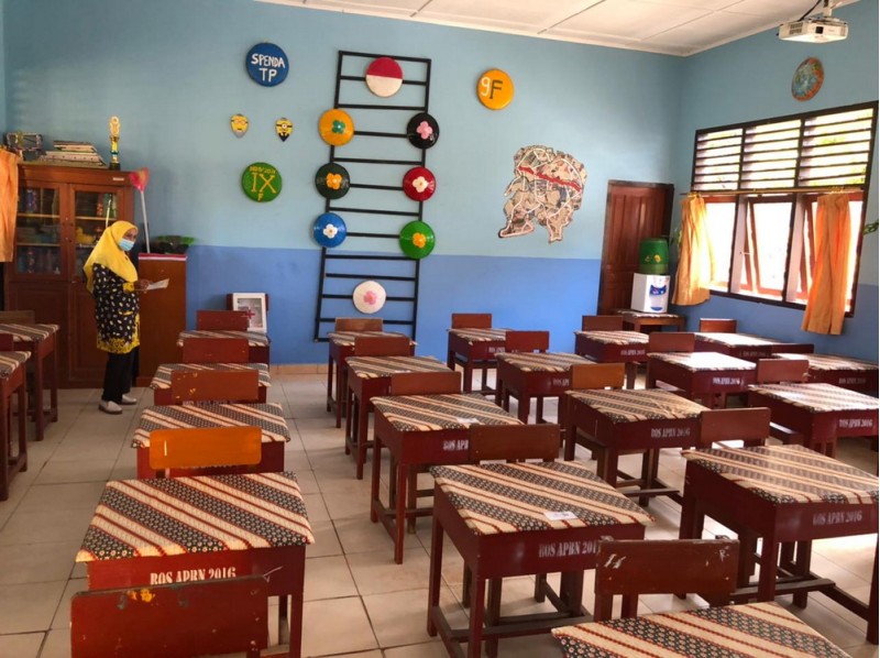 lemari, meja, kursi, papan tulis, pintu, jendela, keberadaan gambar presiden