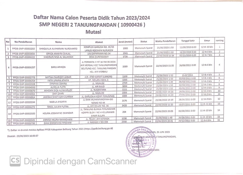 Diberitahukan kepada calon peserta didik baru yang sudah lolos untuk melakukan pengambilan nomor urut daftar ulang di halaman SMP Negeri 2 Tanjungpandan