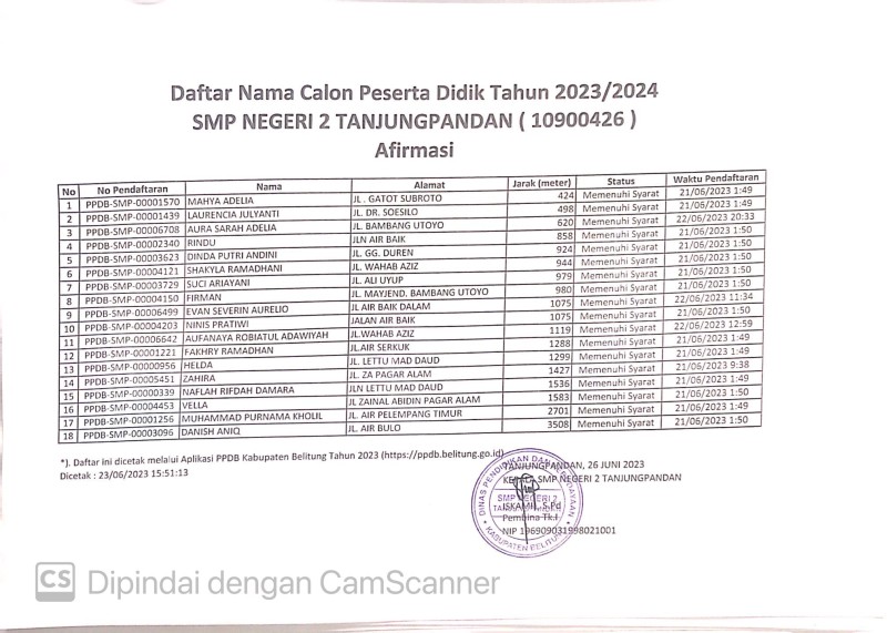 Diberitahukan kepada calon peserta didik baru yang sudah lolos untuk melakukan pengambilan nomor urut daftar ulang di halaman SMP Negeri 2 Tanjungpandan