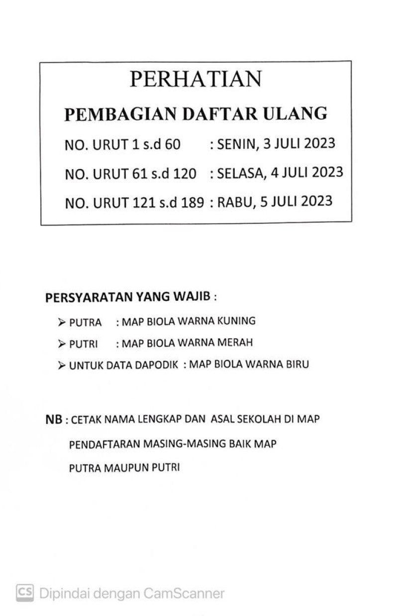 Diberitahukan kepada Calon Peserta Didik Baru untuk melakukan daftar ulang pada tanggal 3 juli 2023, sekaligus pengambilan nomor urut daftar ulang langsung di halaman SMP N 2 Tanjungpandan dengan membawa persyaratan dan ketentuan yang ada di formulir. Bagi yang belum mengambil Formulir silahkan langsung ke halaman SMP N 2 Tanjungpandan dengan membawa bukti Pendaftaran pada saat mendaftar di link pppd.belitung.go.id